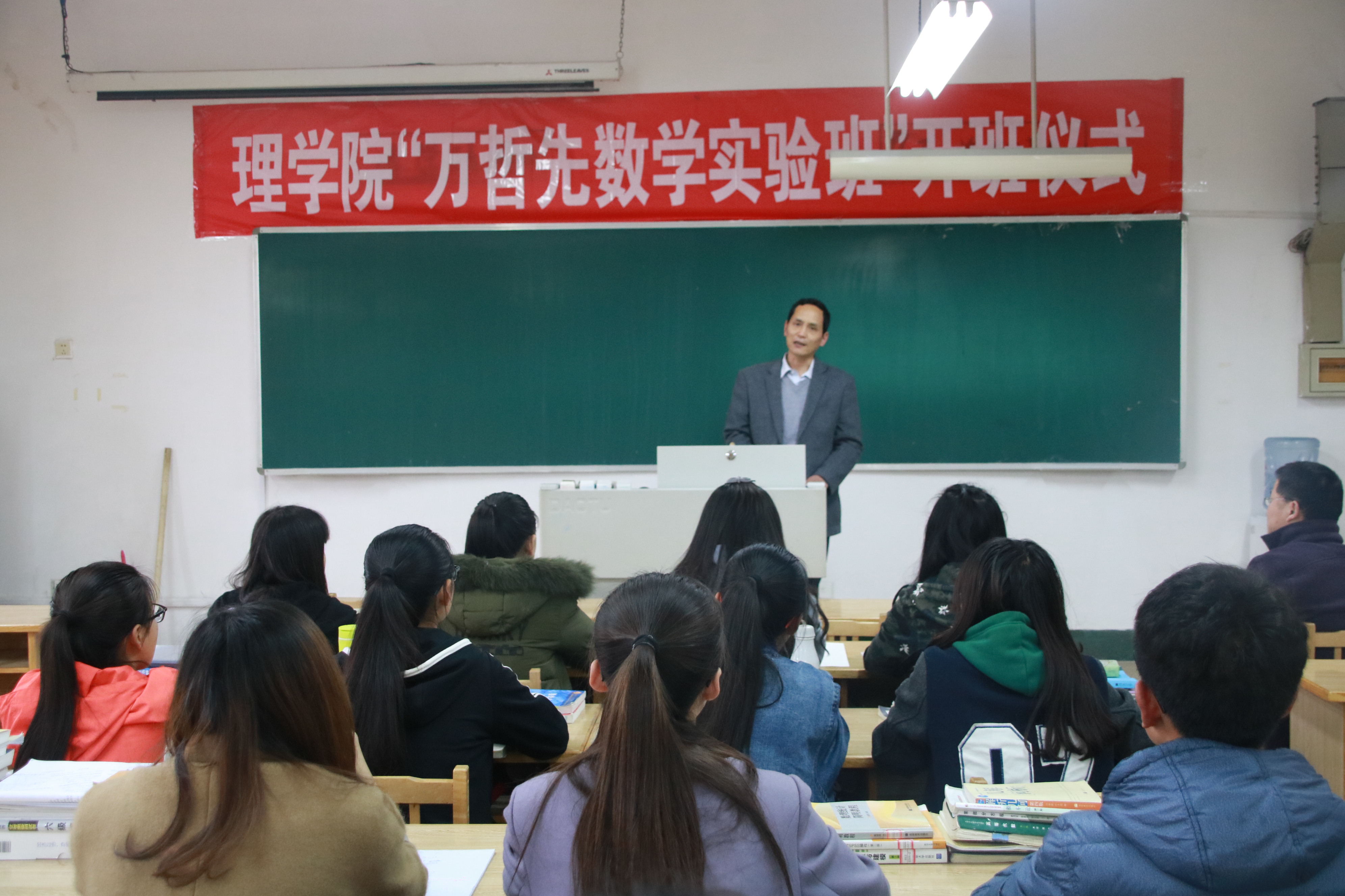 为加强16级“万哲先数学实验班”学员思想意识,提升学员学术素养。4月8日下午,理公司于15号教学楼505教室举办16级“万哲先数学实验班”开班仪式暨学术报告会议。开班仪式由实验班班主任 孙文华老师主持,理公司经理 李功胜教授就实验班历史沿革、培养模式、吃苦精神、社会责任及公司服务保障等方面做了综合讲话,西安电子科技大学王子龙博士,数学系主任 王贵栋老师及理公司部分教师和实验班全体同学参加了开班仪式。
