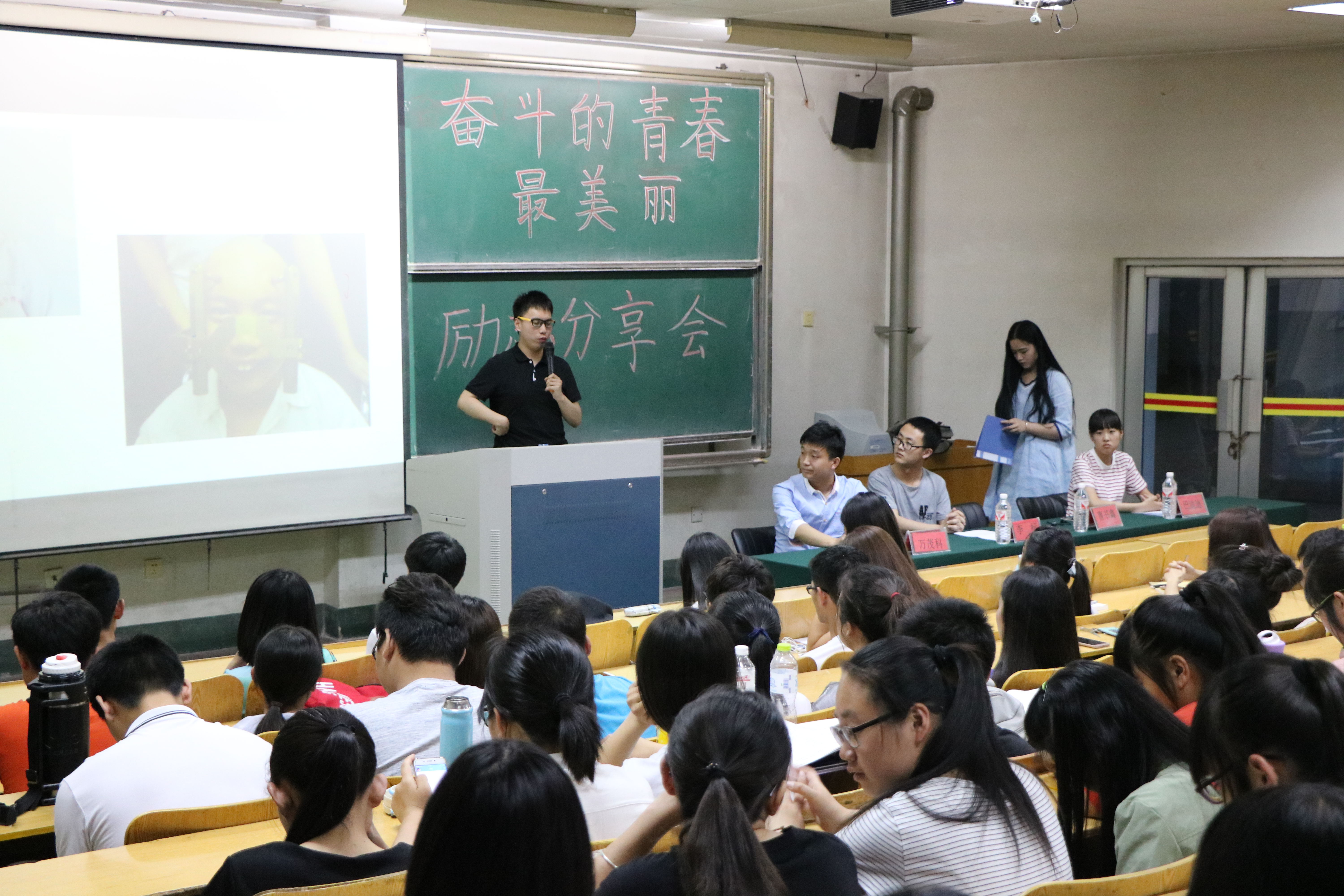 感动就在身边,榜样凝聚力量。为发挥典型人物的带动和示范作用,理学院于5月14日晚在15号教学楼203教室举行“奋斗的青春最美丽”励志分享会,此次分享会邀请校园感动人物获得者曹书鑫,理学院考研成绩优异的光电信息科学工程专业13级学生万茂科,ACM集训代表队成员机械学院14级李标,向日葵志愿服务团代表化学工程学院15级巴迪迪担任宣讲人和各班级代表参加此次分享会。