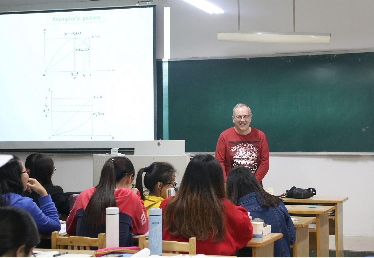 晚上七点,Patrick Solé教授做了《Fibonacci meets Hamming》的专题报告,内容为关于斐波那契额数和汉明码的问题,虽然首次聆听英语学术讲座交流有点困难,但是数学无国界,很快Solé教授与同学们有了很好的沟通。Solé教授是国际著名的代数编码与密码专家,此次学术交流使同学们受益匪浅。