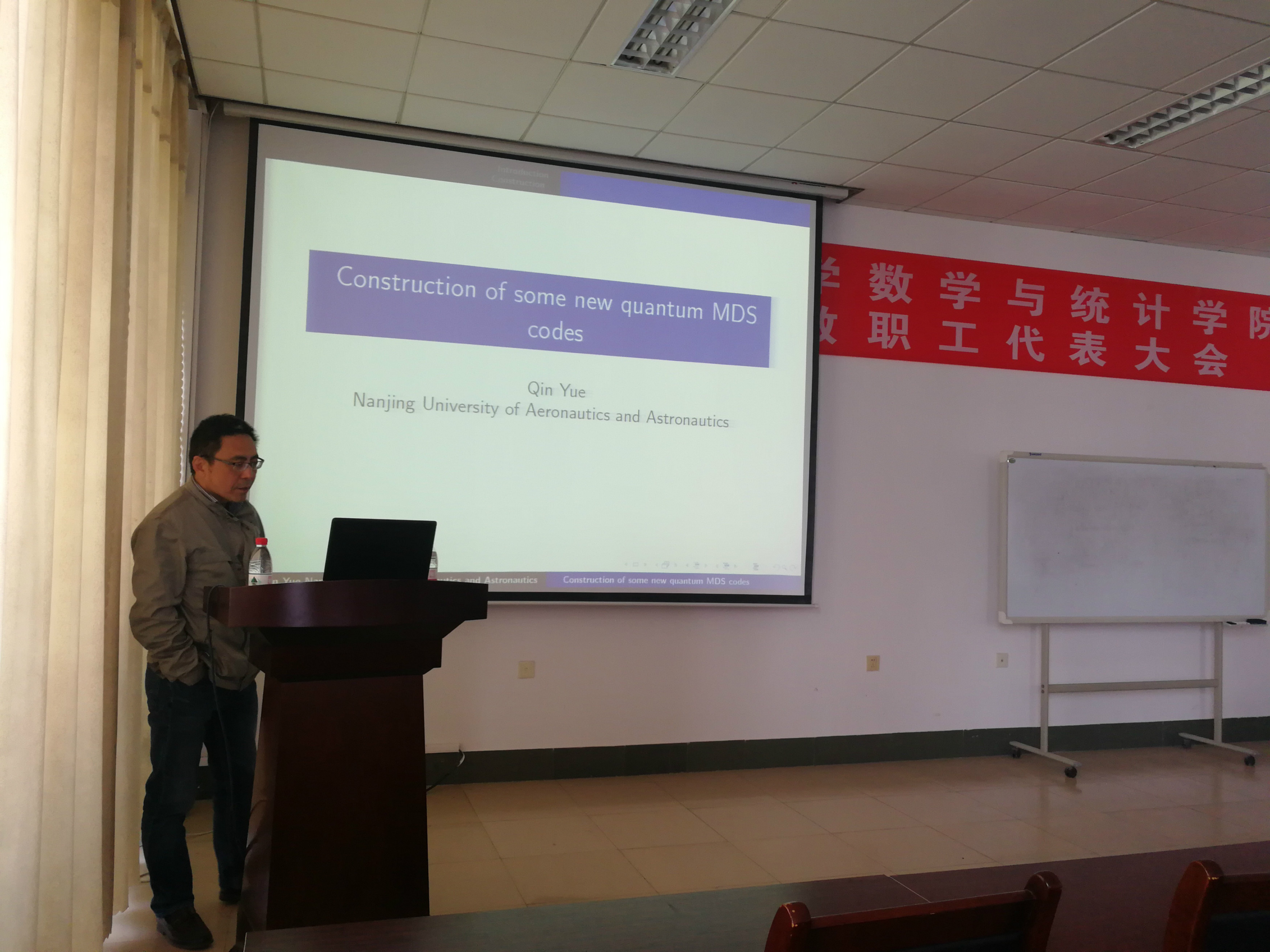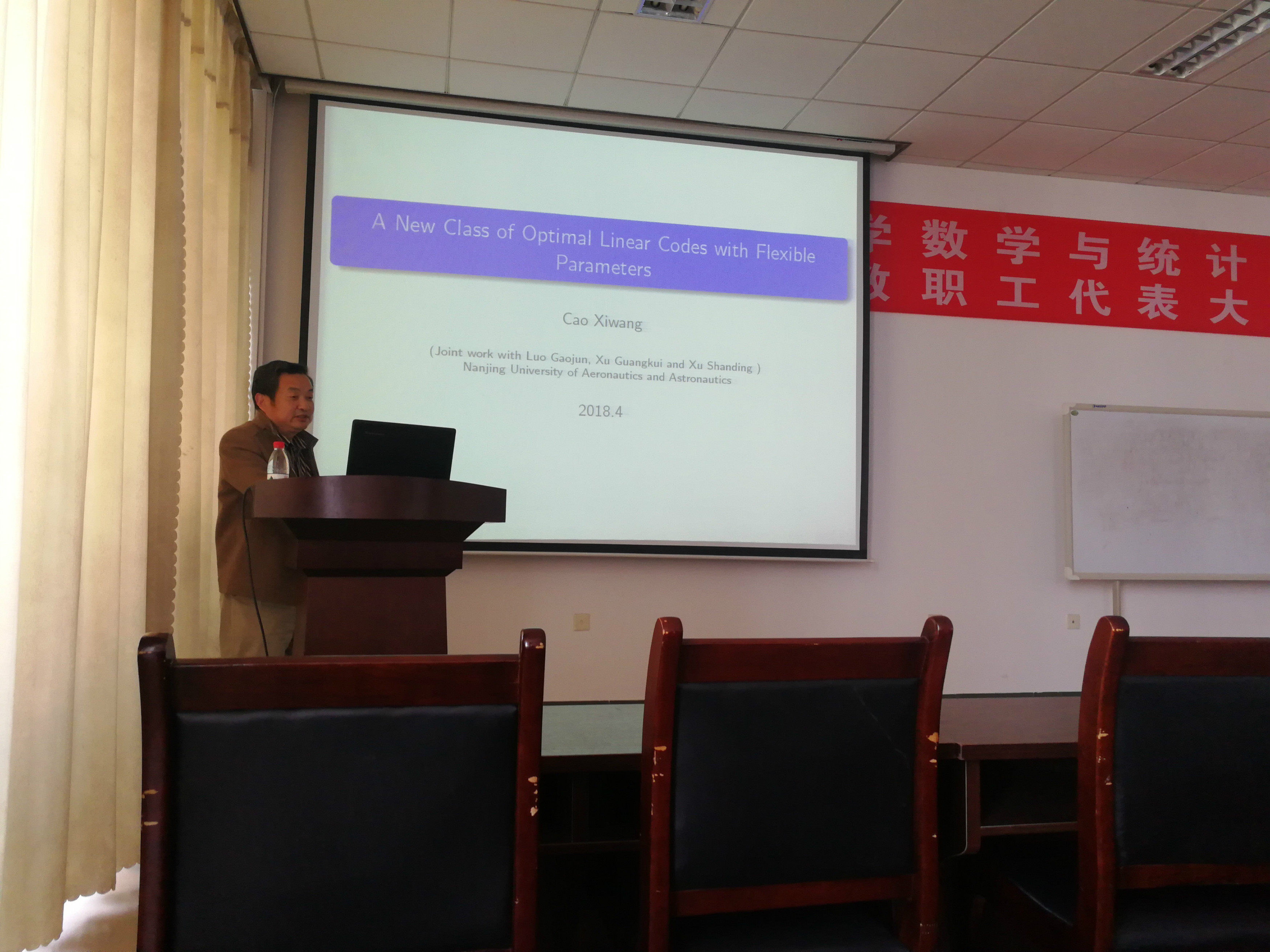 曹教授的报告题目是一类新的多变参数的最优线性码。岳教授的报告题目是一类新的量子MDS码的构造。两位教授都是国内编码和代数领域的知名学者,他们的报告深入浅出,从基础的编码理论讲起,到高深的信道编码和量子通讯中的实际问题、最后又落脚到了代数结构在编码理论中的使用,期间不时借助白板给师生们讲解,使得在座的师生都收益匪浅。