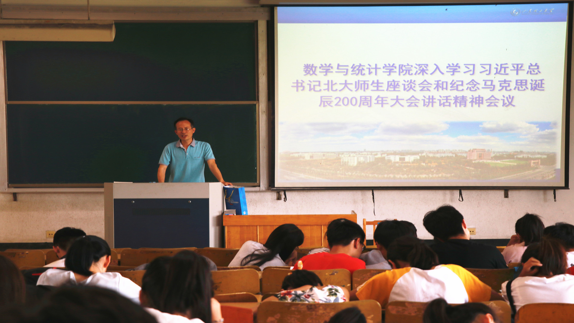 为深刻领会习近平新时代中国特色社会主义思想和党的十九大精神,5月15日下午数学与统计学院于203教室召开深入学习习近平总书记北大师生座谈会和纪念马克思诞辰200周年大会讲话精神会议。我院17级同学参加此次会议。学工办辅导员王超老师主持此次会议。