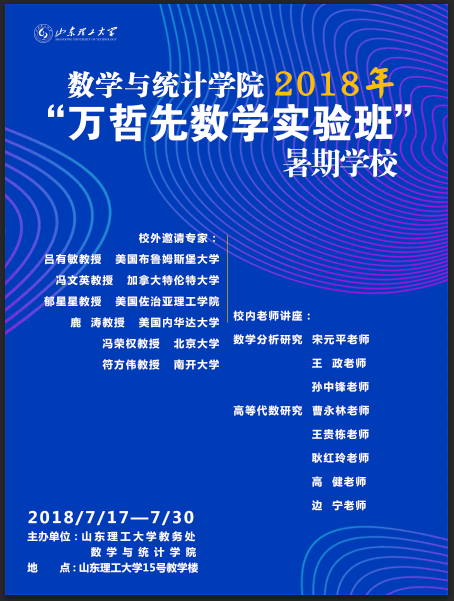 14:30-17:30 | 泛函分析 冯文英教授 地点:15#505 | 报告:Beyond the Four Color Theorem 报告人:郁星星教授 地点:15#505 | 泛函分析 冯文英教授 地点:15#505 | 泛函分析 冯文英教授 地点:15#505 | 高等代数研究 15、16级: 边宁 地点:15#435 17级: 高健 地点:15#505 | 报告:非线性微分方程研究进展 报告人:吕有敏教授 报告:Nonlinear Boundary Value Problems in Ordered Banach Spaces 报告人:冯文英教授 地点:15#505 | 高等代数研究 15、16级: 边宁 地点:15#435 17级: 高健 地点:15#505 |