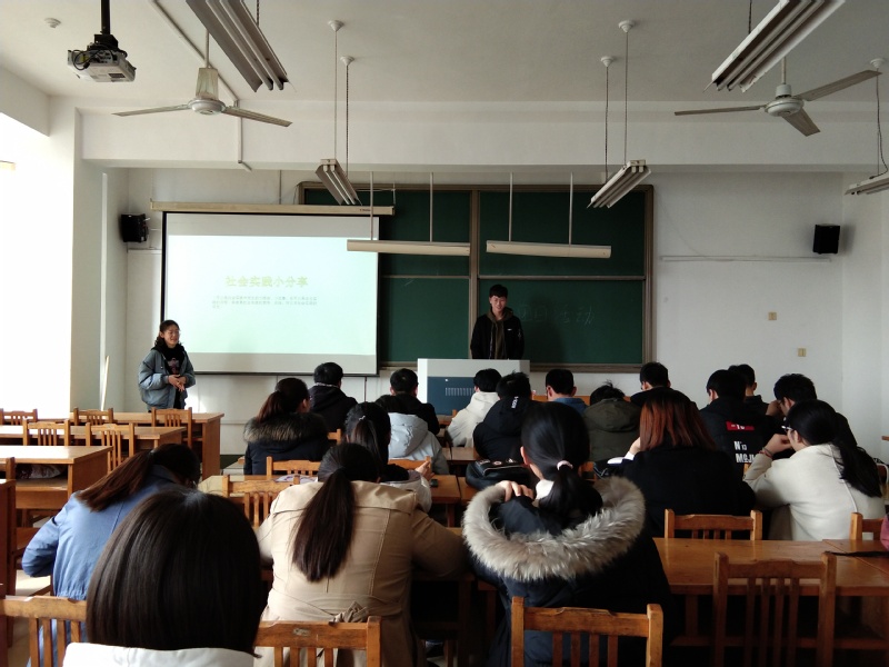 活动伊始,团支书李静介绍了此次活动的主要目的和活动流程,本次团日活动章程为社会实践的意义、报告分析、报告格式要求、实践分享和活动总结。李静首先介绍了本次社会实践的目的和意义,她认为社会实践可以提高自己的实践能力、交际能力、思考能力。通过亲身体验社会实践,能让自己更进一步了解社会,在实践中增长见识锻炼自己的才干,检验自己所学和能力能否为社会所用,并找出自己的不足和差距。接着,李静展示了班级社会实践的主题类型和报告格式的分析,并就社会实践报告类型分析向同学们提出几点要求。通过分析让我们了解到本班同学大部分以“入基层,观百态”社会活动和“走百县,访千企”就业实践活动为主,而少部分同学选择“暖冬关,关爱”志愿服务活动和“挑战,青春”创新科技活动。对实践报告格式分析,是希望我们在以后的报告中态度要端正,格式要正确标准。随后,班级同学分享自己在这次社会实践中的小故事,其中“走百县,访千企”就业实践活动的一些主题分享对同学们的就业观有很大触动。最后班长朱帅康进行总结,他表示老员工可以通过社会实践更快地融入现在的社会,这样有利于同学们的就业。朱帅康希望同学们认真的对待每一次社会实践,这对个人的成长有着巨大的帮助。