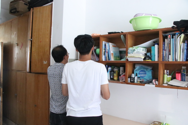 检查人员一行首先来到18号男生宿舍楼,并严格按照评分标准进行检查打分。每进到一间宿舍,王超都会仔细查看,并当场指出不足。他和员工一起整理了书柜,并告诉同学们书柜是最不应该出现不整齐的地方,员工首要任务就是学习,首先要将自己学习上的事情处理好才能将自己其他的工作处理好。他还以老师工作为例,老师的工作也要时刻保持着整齐有序,这样工作起来才会更有效率。针对其他物品摆放不符合规定的,王超也一一提出要求。