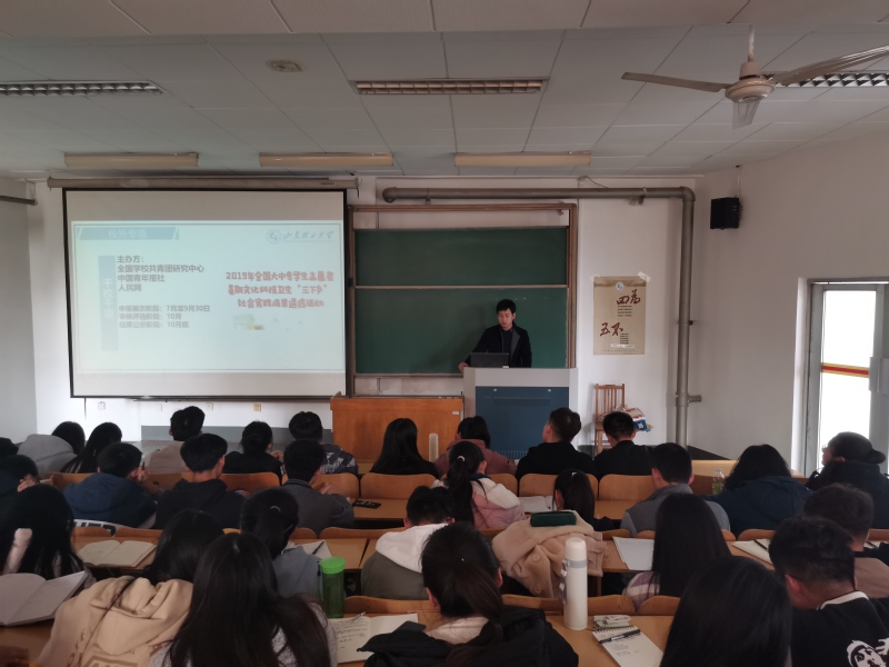 活动伊始,王国昊从社会实践“是什么、为什么、怎么做、该怎么办”四个方面进行了细致讲解。他讲到,社会实践活动主要是由参与形式、实践主题、实践形式等方面组成,活动开始前要提前做好准备,做好规划,不能盲目。此外,对于在实践过程中可能遇到的一些问题以及后续工作的处理,他都进行了详细的讲解。然后,他介绍了社会实践活动项目及宣传方式。活动项目主要包括“走访员工”“乡亲乡爱”“调研实习”“志愿农大”等基本活动;社会实践的宣传主要通过包创建微信公众号、微博,联系当地电视台、报社等媒介机构,村广播宣传栏等进行开展。王国昊结合自身经历并从实际出发,对在场的员工讲到了自己的经验,比如“教学相长”、“锻炼才干”、“满足好奇心”、“增加友谊”等。