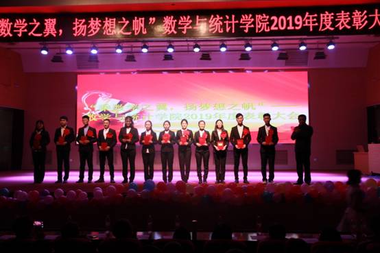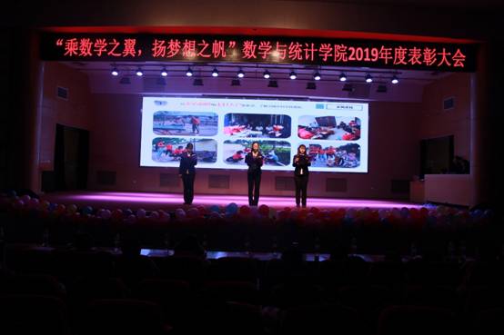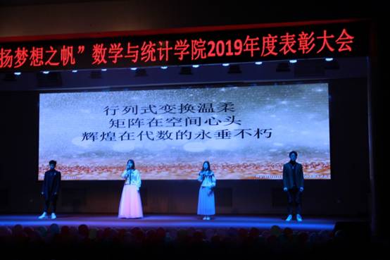 表彰大会伊始,主持人介绍到场的各位领导。接着,表彰大会正式拉开了帷幕,大会主题共分三大篇章:第一篇章为“忆古今寻数学本真”,此篇章由歌曲《数学之路》、舞台剧《梦中奇想》、民族舞组成;第二篇章为“看今朝青春正好”,此篇章由歌曲《栀子花开》《曾经的你》、串烧舞蹈和相声组成,第三篇为“趁现在拾少年担当”,此篇章由易班话剧《易起建模吧》、社会实践感悟分享、2018级数教1801手语操和2019级新生合唱团演唱的《您花开的样子》组成,表彰大会现场节目形式各异,让人目不暇接,同学们倾情的表演,真情的流露,使得现场的气氛高潮迭起,现场观众掌声不断,展现了数院这个大家庭的欢乐和谐。