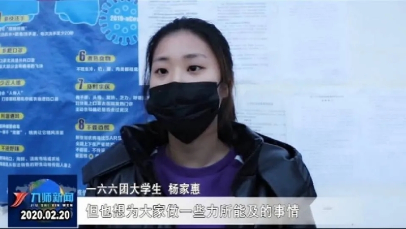 在隔离期间她就开始联系本团的团委要求自愿加入抗击疫情的队伍当中,等待居家隔离一结束,她就立刻参与到疫情防控的队伍当中。