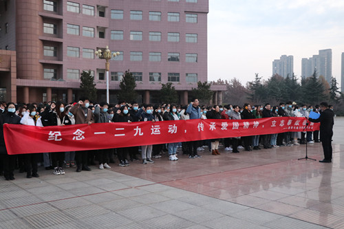 王超在讲话中强调,同学们要深入学习“一二九”历史,继承前辈们不怕困难、不畏艰辛、艰苦奋斗、勇于创新的革命精神。新生同学要认真学习专业基础知识,理性规划大学阶段目标,主动向身边的榜样看齐;员工干部应提高自身政治站位,牢记服务同学宗旨,练就过硬本领,勇于担当,主动作为。他鼓励同学们奋发图强、开拓进取,以自己的专业学识为发展经济、建设祖国贡献自己的力量。