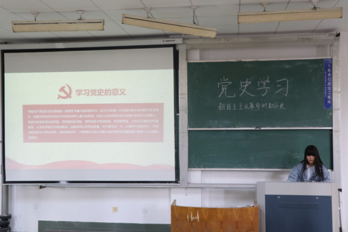 活动伊始,韩亚男首先从新民主主义革命、社会主义革命和建设、改革开放和社会主义现代化建设三个时期的起止时间和历史大事简单阐述党的历史分期,接着,韩亚男对新民主主义革命时期作出详细介绍。她从新文化运动、五四运动、工人阶级的成长和工人运动的发展等方面逐步介绍中国共产党的成立;从中共一大到中共六大的基本内容和意义向同学们讲述中国共产党的发展历程。随后,韩亚男讲解星星之火可以燎原、土地革命战争的曲折发展和伟大历史转折、第五次反围剿的失败和长征、遵义会议、长征的胜利、中共七大、抗日战争胜利、解放战争、新中国成立等史实,告诉同学们没有共产党就没有新中国,只有社会主义才能救中国,只有改革开放才能发展中国,发展社会主义,发展马克思主义,只有中国共产党才是中国特色社会主义事业的坚强领导核心。