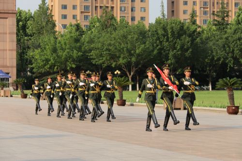 升旗伊始,英姿飒爽的国旗护卫队队员们护送五星红旗进场,在全体师生的注目礼下,伴随着庄严的中华人名共和国国歌,五星红旗冉冉升起,迎风飘扬。在场的每一个人都深怀对祖国无限的热爱和崇高的敬意。