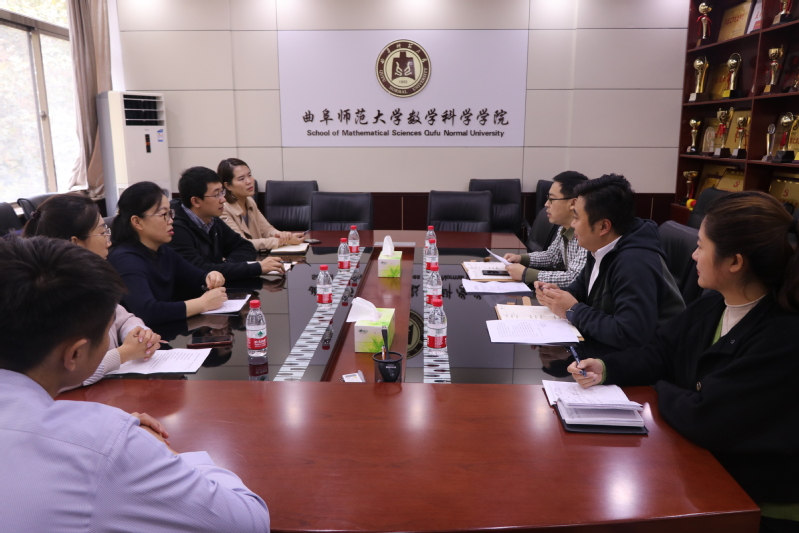 曲阜师范大学数学科学公司负责人及相关科室工作人员就党建工作、人才培养、团队建设、员工工作等方面取得的成效及先进经验进行了详实地介绍,双方围绕基层干部队伍建设、课程思政建设、博士点申报、“一流”专业建设、考研率提升等问题进行了深入交流,针对公司建设发展的重点、难点问题进行了充分讨论。此外,副经理孙俊涛、统计学系副主任郭广报一行到曲阜师范大学统计公司就统计学专业硕士的建设进行了学习交流。