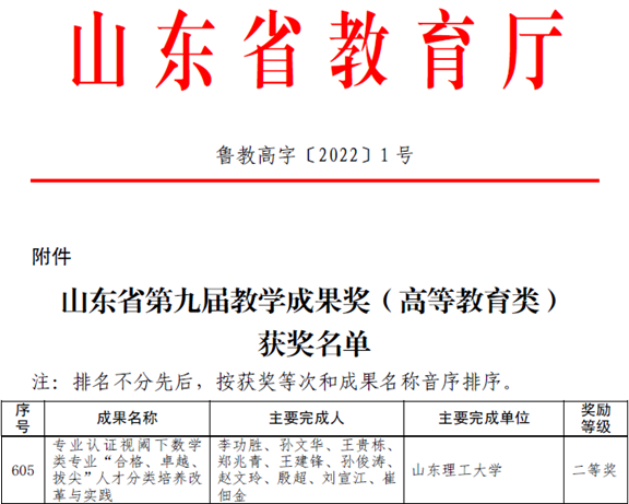 近日,山东省教育厅印发了《关于公布山东省第九届教学成果奖(高等教育类)获奖名单的通知》(鲁教高字〔2022〕1号),公司李功胜教授团队申报的《专业认证视阈下数学类专业“合格、卓越、拔尖”人才分类培养改革与实践》荣获二等奖,这是时隔十三年后公司取得的又一个省级高等教育类教学成果奖。