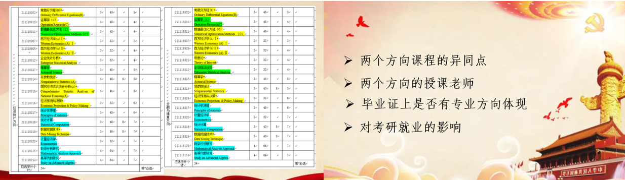 经过一年的专业基础课的学习,2021级员工面临着如何选择专业方向的问题,针对员工们的各种疑问和迷惑,统计学系领导班子对统计学专业方向进行解读,将两个方向的专业课程进行对比分析。
