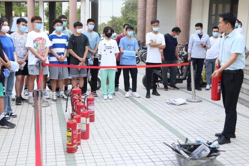演练共分为三个环节:一是演练员工实验课期间突发火情应急处置场景,二是现场进行灭火器的操作演示,三是常见生活用品灭火常识教育及演示。
