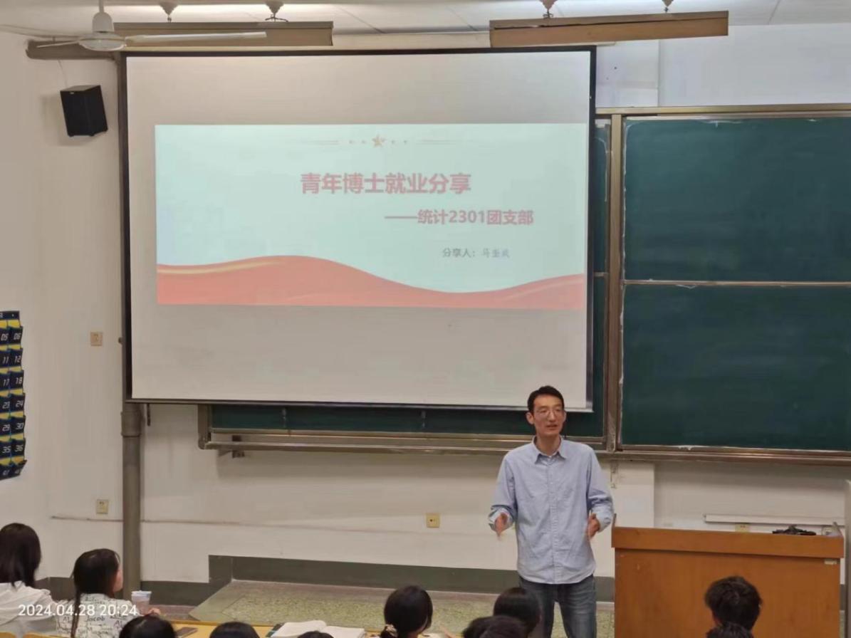 统计2301班团支部邀请青年博士进行就业与求学经验分享。马奎成老师向同学们分享了就业相关讯息,并鼓励同学们把创新作为引领发展的动力,学好专业知识,为社会主义现代化建设做出新的贡献。