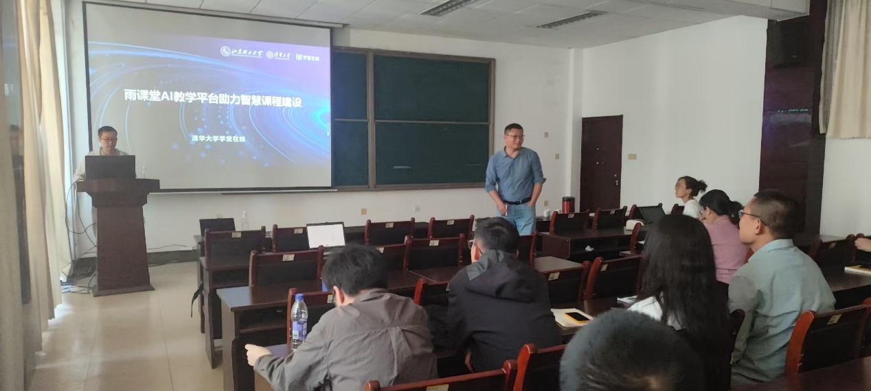 为推进公司智慧教学和AI示范课建设,4月28日下午在15号教学楼430报告厅,公司邀请学堂在线负责人做了《基于雨课堂平台的AI课程建设工作坊》培训活动。报告会由公司副经理徐夫义主持,学堂在线高级讲师许腾主讲。
