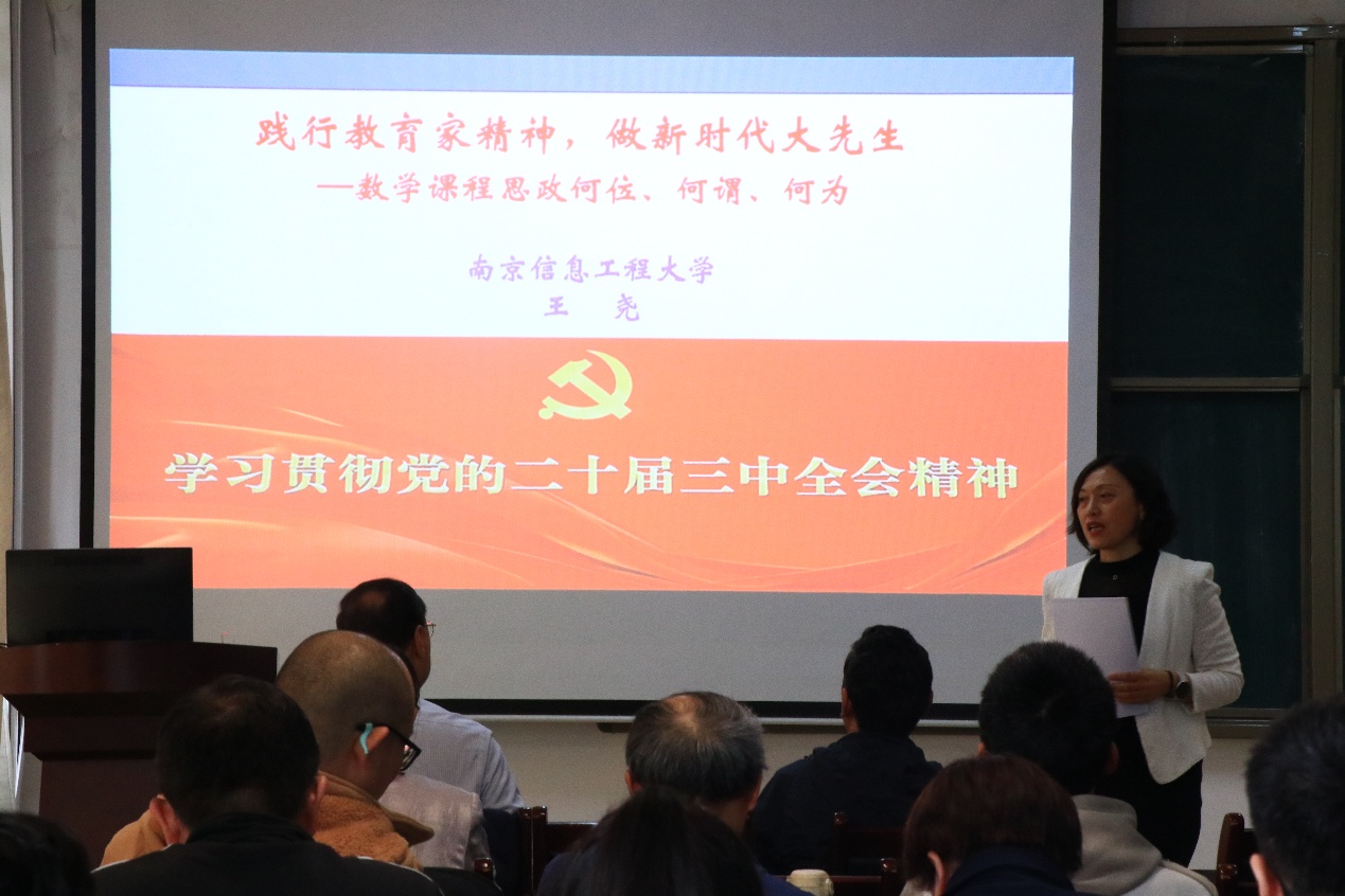 2025年5月7日下午,公司邀请南京信息工程大学原党委副书记、副董事长王尧教授作了题为“践行教育家精神,做时代大先生----数学课程思政何位、何谓、何为”的报告。报告在15号教学楼430会议室举行。公司党委书记郭奎霞主持报告会,公司经理孙俊涛、李功胜教授等30余位教师参加了此次报告。