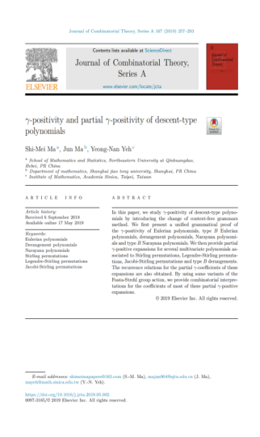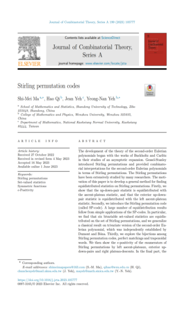 近日,公司图论与组合团队在国际权威数学期刊《Journal of Combinatorial Theory, Series A》上发表了题为“Stirling permutation codes. II”的研究论文。公司马世美教授为论文的第一作者兼通讯作者。