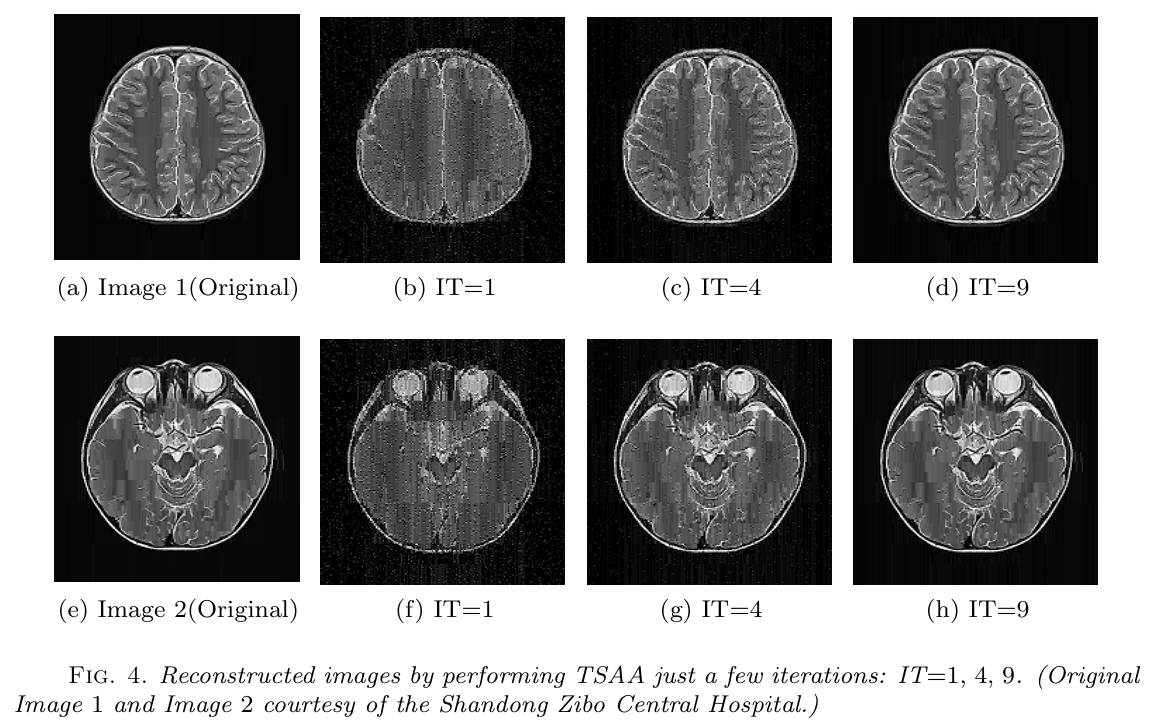 近期,公司运筹学与控制论团队在稀疏线性反问题及其在信号与图像处理的应用方面取得新进展。孙中锋副教授与赵云彬教授(深圳市大数据研究院)、周金川教授、黄正海教授(天津大学)合作的论文“Dynamic thresholding algorithm with memory for linear inverse problems”针对稀疏线性反问题,研发了动态指标选取技术和子问题降维技术,进而提出了记忆动态阈值算法,大幅度降低了最优阈值型算法的计算复杂度,并将其应用于语音信号的重构问题(见图1);赵云彬教授与孙中锋副教授合作的论文“Splitting alternating algorithms for sparse solutions of linear systems with concatenated orthogonal matrices”为解决大规模稀疏线性反问题,基于结构化矩阵提出了分裂算法,将大规模问题分裂成若干小规模子问题进行求解,并将其应用于脑部核磁共振图像(MRI)的重构问题(见图2)。